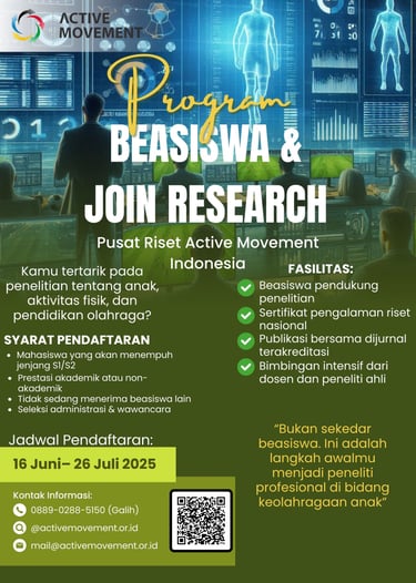 Malang, 14 Juni 2025 – Mahasiswa aktif jenjang S1 dan S2 Fakultas Ilmu Keolahragaan Universitas Negeri Malang (FIK UM) kini memiliki peluang emas untuk terlibat dalam dunia penelitian sekaligus meraih beasiswa bergengsi. Active Movement Indonesia, sebuah pusat riset yang berfokus pada aktivitas fisik anak dan pendidikan olahraga, resmi membuka program Beasiswa & Join Research Team 2025.