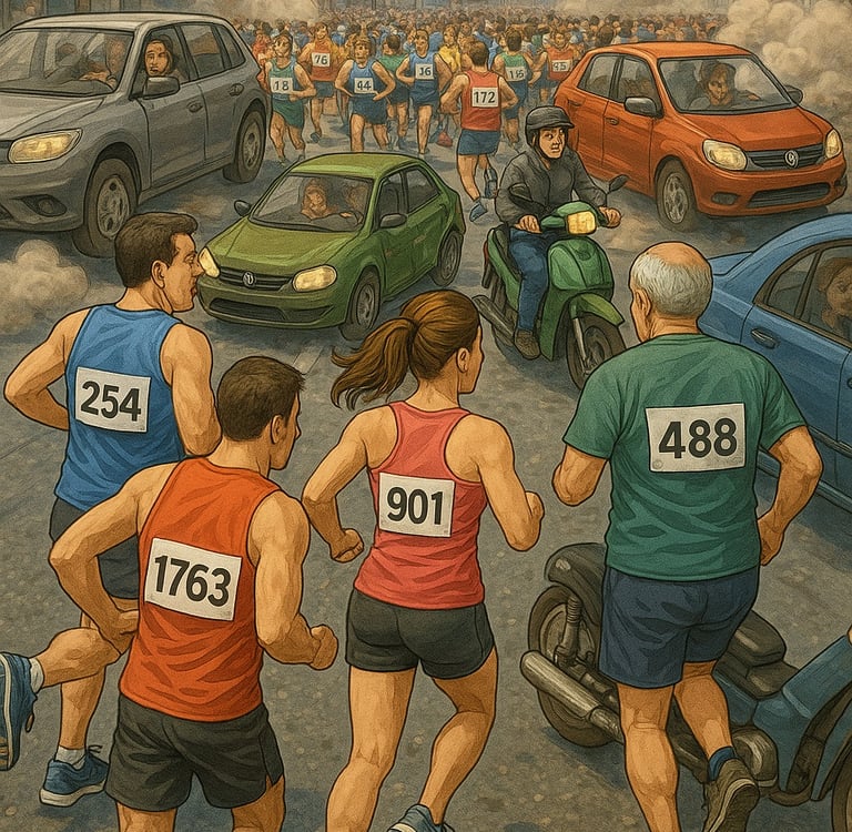Memang nasib pelari gratisan, mau cari keringat aja nggak ada ruang. Sungguh dilematis, antara menghirup oksigen atau menyedot karbon monoksidanya “cumi-cumi darat”. Sebuah fenomena olahraga unik bagi masyarakat kota. Mereka tidak punya pilihan, karena kalau tubuh tidak olahraga jadi gampang sakit-sakitan. Maka tak bisa dipungkiri bahwa olahraga sudah menjadi gaya hidup masyarakat perkotaan. Mereka butuh ruang-ruang olahraga yang sehat, nyaman, dan aman.