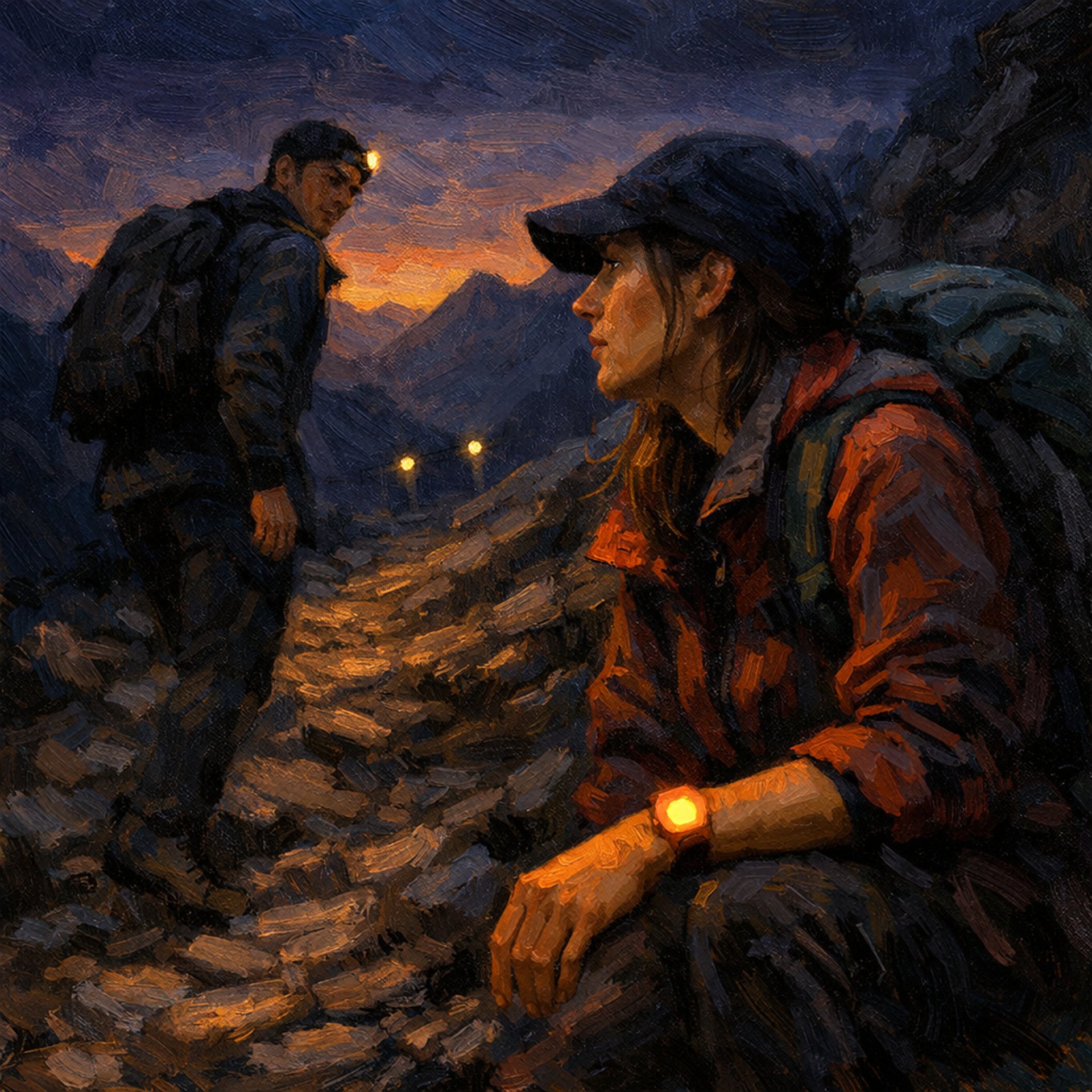 Setiap langkah menanjak membuat warna di layar berubah. Hijau bergeser ke kuning, kuning menuju oranye. Seolah jam itu hidup, mengikuti ritme langkahnya, mengomentari dengan sinis setiap tarikan napasnya. Sica beberapa kali menengoknya, refleks sosialita yang terbiasa mengukur segalanya: progres, intensitas, capaian. Namun di sini, data itu tidak bisa disembunyikan di balik filter. Gunung memaksa kejujuran. Otot pahanya terbakar, tungkai lecet karena sepatu mahalnya, napasnya pendek, dan ia mulai memahami konsep specificity of training—bahwa tubuh beradaptasi secara spesifik terhadap tuntutan yang dialaminya. Pilates membentuk stabilitas, gym membangun kekuatan, tetapi tanjakan panjang ini meminta sesuatu yang lain: ketahanan yang berkelanjutan, kesabaran mekanis, dan mental yang tidak mudah panik.